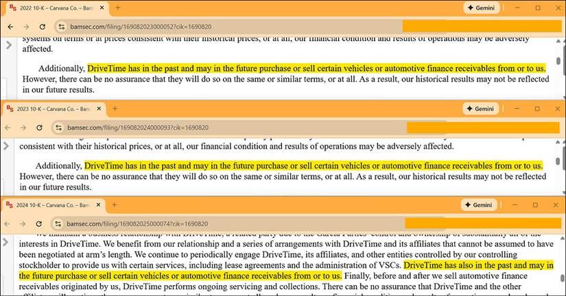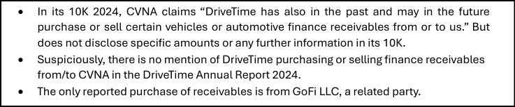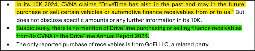 Claim: “CVNA 10K ’24 claims it has and may sell loans to DriveTime, but the DriveTime AR does not confirm this claim. Neither CVNA nor DriveTime disclose when nor how much…Both of these can’t be true.”