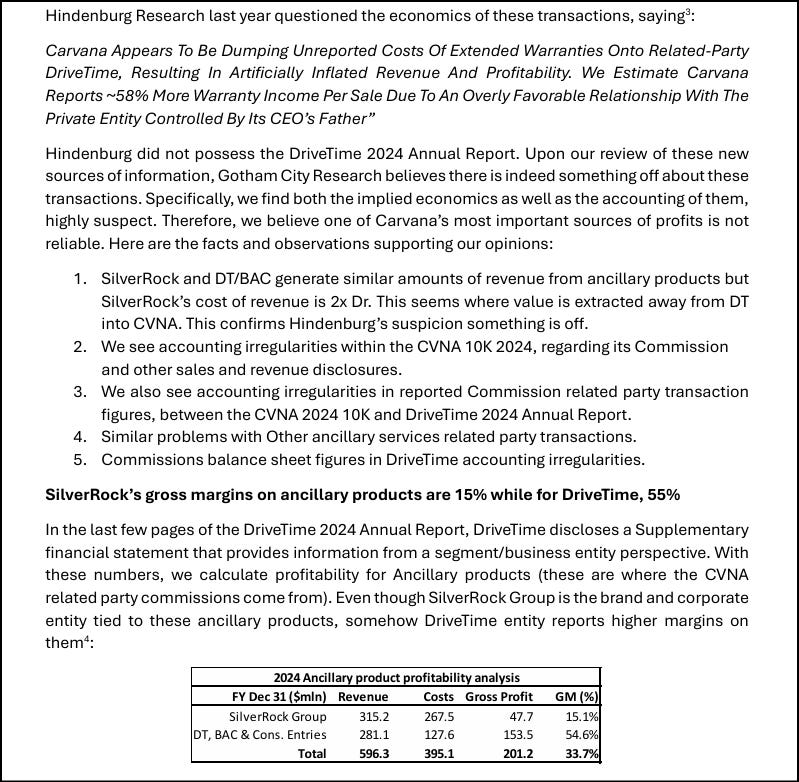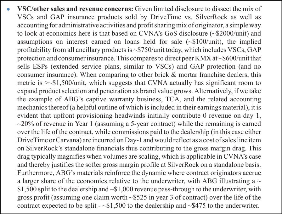 Regarding Vehicle Service Contracts (VSCs), Gotham stated that SilverRock’s gross margins on ancillary products are 15% while DriveTime’s are 55%, with the claim being SilverRock is taking on lower economics to support the high commission paid to CVNA for originations.