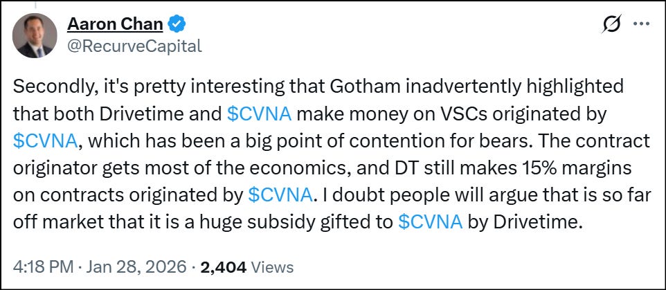 Aaron Chan posted the following regarding the VSCs, where both DT and CVNA make money on VSCs originated by CVNA, and where originators get more of the economics while underwriters still earn decent margins is not that off market.