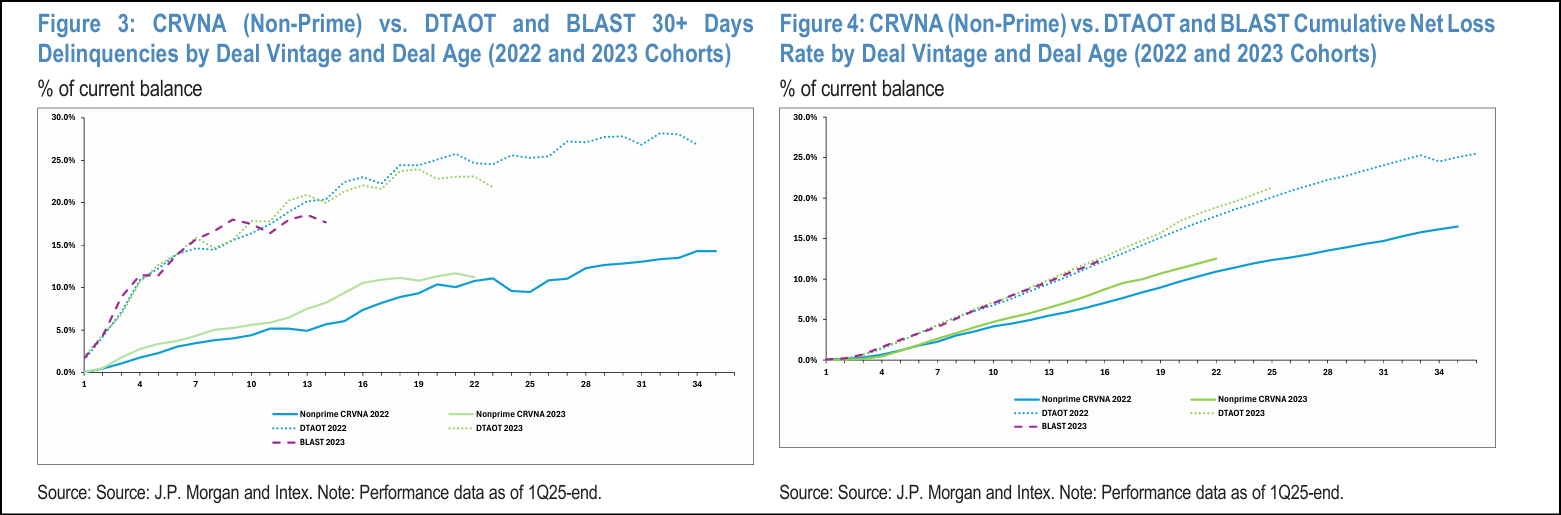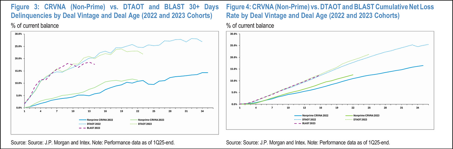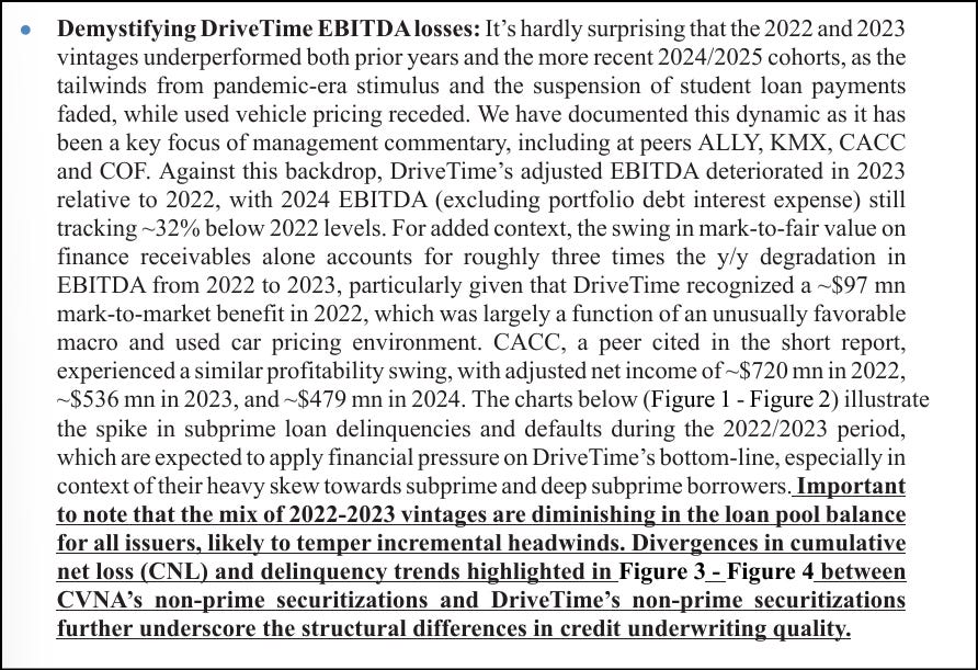 JPM expanded on these adjusted EBITDA losses, the underperformance of the ‘22 and ‘23 vintages, the mark-to-fair value on the finance receivables, and the differences in underwriting seen in the differences in delinquencies and CNLs between DT and CVNA.