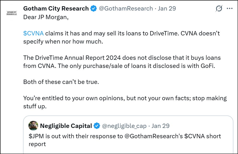 Below is Gotham’s only response to JPM’s note, that these statements by CVNA vs DT don’t match.