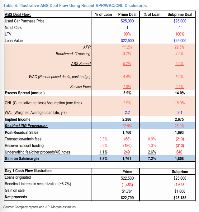 Below is the corresponding Table 4 from JPM, with the illustrative example of CVNA’s gain on sale margin calculation (including the service fees for prime vs nonprime discussed earlier):