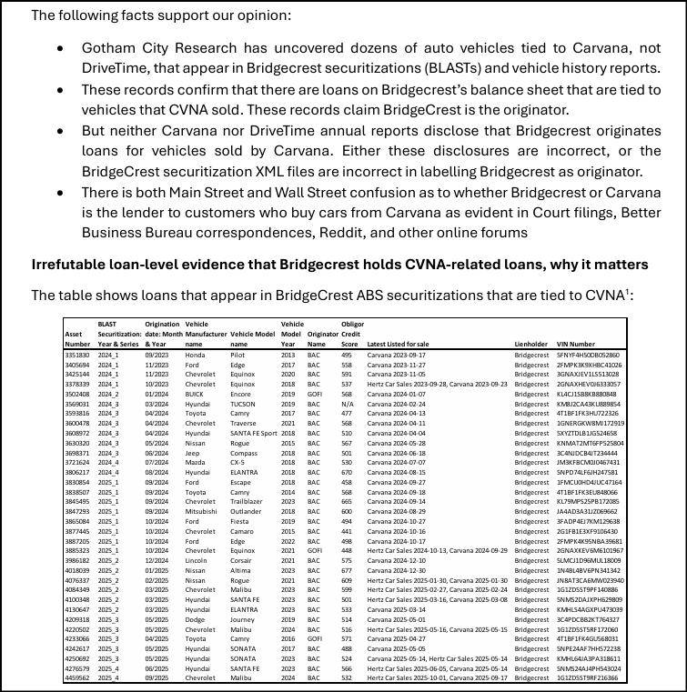 One other related item is Gotham provides what they view as “irrefutable loan-level evidence that Bridgecrest holds CVNA-related loans”.