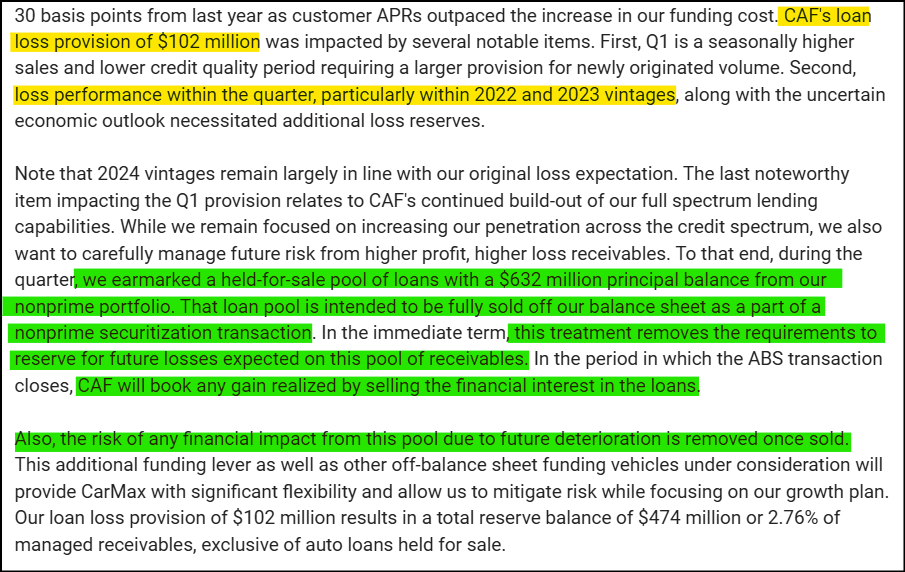 KMX wrote down currently-held loans due to ‘22 and ‘23 vintages (like DT).