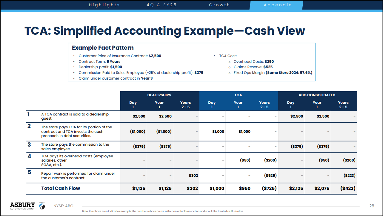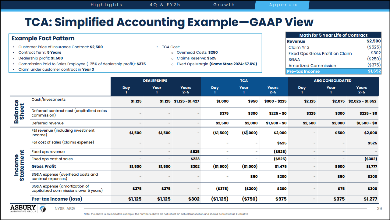 JPM answers this by explaining how the drag for SilverRock is from the upfront commissions paid to CVNA vs earning / recognizing the revenue over the rest over the life of the contract as it is earned, and where this gets exacerbated by growing volumes by CVNA. JPM shared an example from Asbury Automotive Group (ABG) and Total Care Auto (TCA), who provides the VSCs among other products like for maintenance and protection (I include the related slides below).