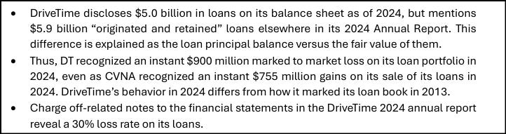 Claim: “DT recognized an instant $900 million marked to market loss on its loan portfolio in 2024, even as CVNA recognized an instant $755 million gains on its sale of its loans in 2024.”