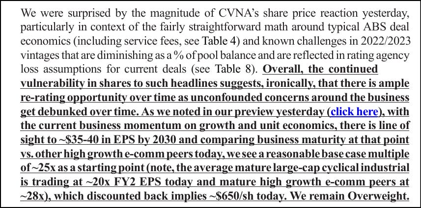 Looking ahead, following CVNA’s upcoming earnings next week, I will update the Quarterly Earnings Analysis and the CVNA vs KMX Analysis (which is helpful in understanding why CVNA trades at the multiple it does, why CVNA earns more in finance GPU than KMX and what KMX is doing about it, and much more).