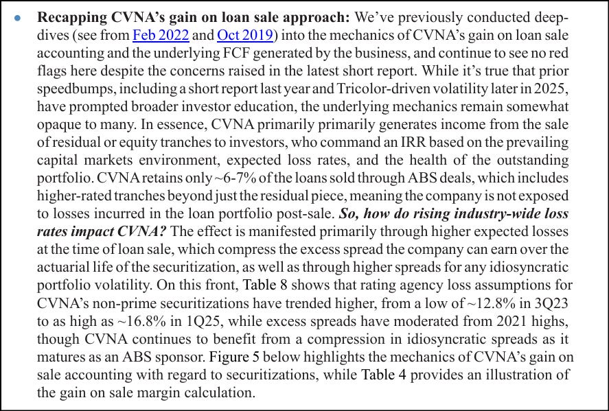 Second, this is not unique to DriveTime. KMX and others (like JPM referenced in their note above) had similar write-downs for the ‘22 and ‘23 vintages in later years, given they hold their loans vs selling them like CVNA. This is a reason KMX is now switching to be more like CVNA and sell their loans after origination instead of holding, to remove this negative dynamic, and show similar gain on loan sales (which is an important fact, given others have questioned why others in the industry don’t / can’t do the same, and now you have KMX doing exactly that).