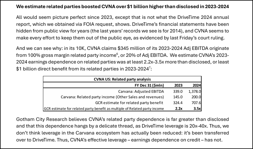 Claim: “Related parties boosted CVNA over $1 billion higher than disclosed in 2023-2024… CVNA related party reliance 3x > reported.”