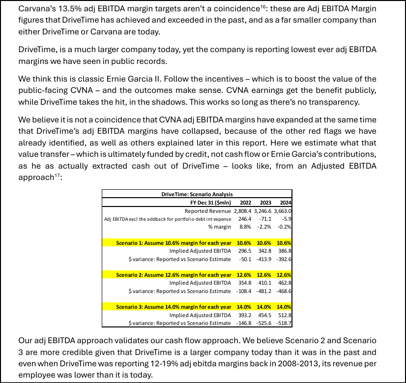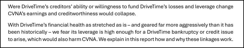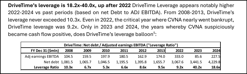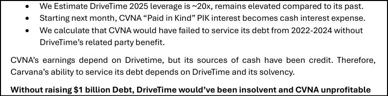 Claim: “Without raising $1 billion Debt, DriveTime would’ve been insolvent and CVNA unprofitable…Carvana’s dependence on DriveTime is incredibly fragile, as DriveTime levered up to 20x-40x in 2023-2024, well beyond its historical levels of 5x-10x.”