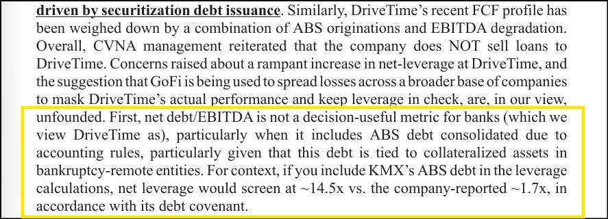 The bankruptcy-remote aspect is also important, since Gotham claims DT’s “leverage is high enough for a DriveTime bankruptcy”, despite these debts not having a claim on DT’s general solvency.