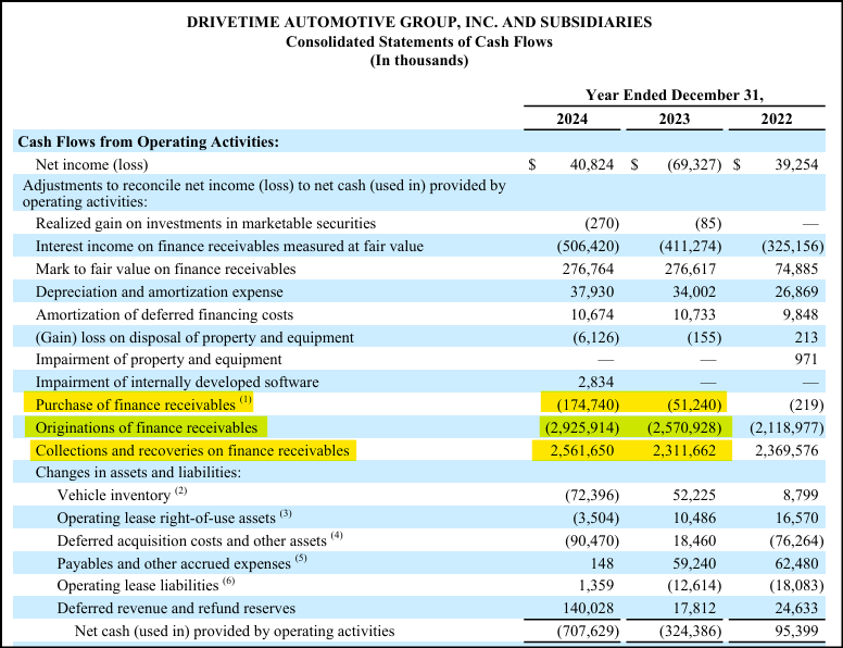 Instead, DriveTime’s negative operating cash flows are driven by originations outpacing collections and recoveries, rather than from boosting CVNA’s earnings with “DriveTime taking the hit”.