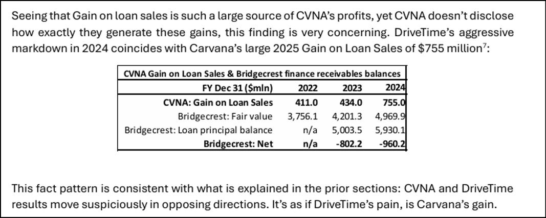 They then imply the “third parties” are actually related parties buying CVNA loans at over-inflated prices (seen by high Gain on Loan Sales with CVNA over the same time period)…