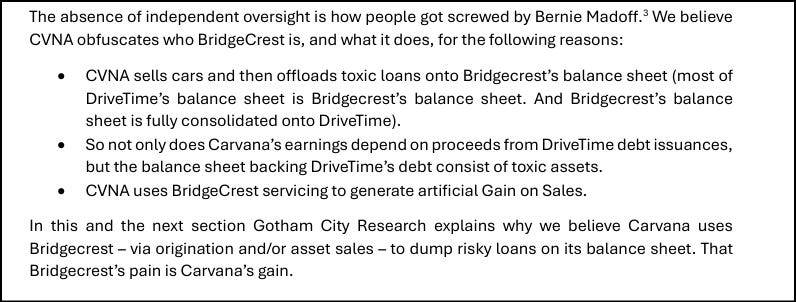 Gotham makes a claim that “CVNA sells cars and then offloads toxic loans onto Bridgecrest’s balance sheet…Carvana uses Bridgecrest – via origination and/or asset sales – to dump risky loans on its balance sheet”.