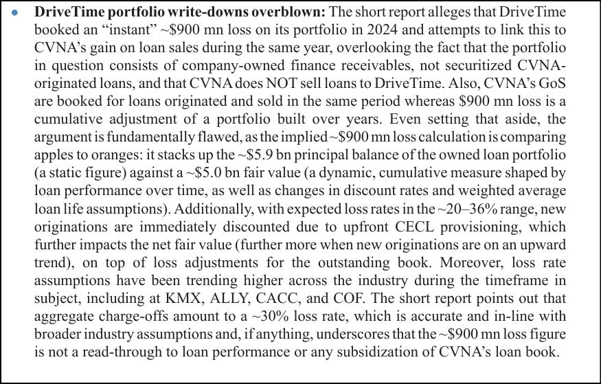 Response: DT’s Cumulative Fair-Value Marks vs CVNA’s 2024 Gain on Loan Sales are Not Comparable. The difference in DT’s origination and fair value was not “instant”, and instead represents a cumulative discount of a loan portfolio spanning multiple vintages, rather than a loss on loans originated in 2024. As a result, it is not comparable to CVNA’s 2024 gain on loan sale (GoS). Additionally, CVNA does not show similar write-downs, given they instead predominately originate and sell their loans (driving the GoS), rather than retaining them on their balance sheet.