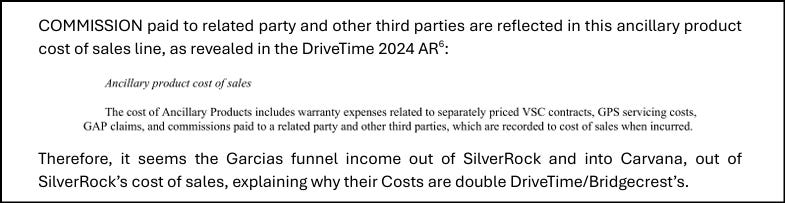 Claim: “SilverRock’s gross margins on ancillary products are 15% while for DriveTime 55%….Even though SilverRock Group is the brand and corporate entity tied to these ancillary products, somehow DriveTime entity reports higher margins on them... it seems the Garcias funnel income out of SilverRock and into Carvana, out of SilverRock’s cost of sales, explaining why their Costs are double DriveTime/Bridgecrest’s.”