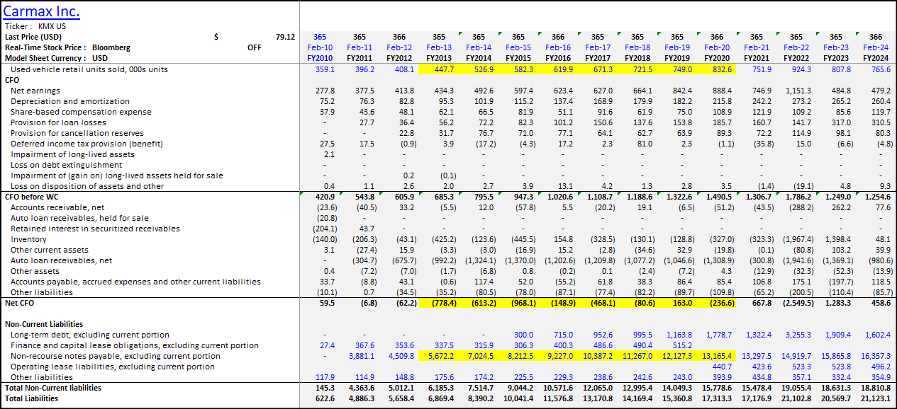 For more detail, I included some KMX financials. This shows what JPM referenced, how during their growth run from FY13-FY20 there was -$3.131B of OCF, and offsetting increasing non-recourse notes. But importantly, you can see below how in FY21 when unit volume declined, “auto loan receivables” in the cash flow statement comes way down, allowing for positive OCF. Then in the next year, FY22, unit volume increases again, leading to negative OCF.