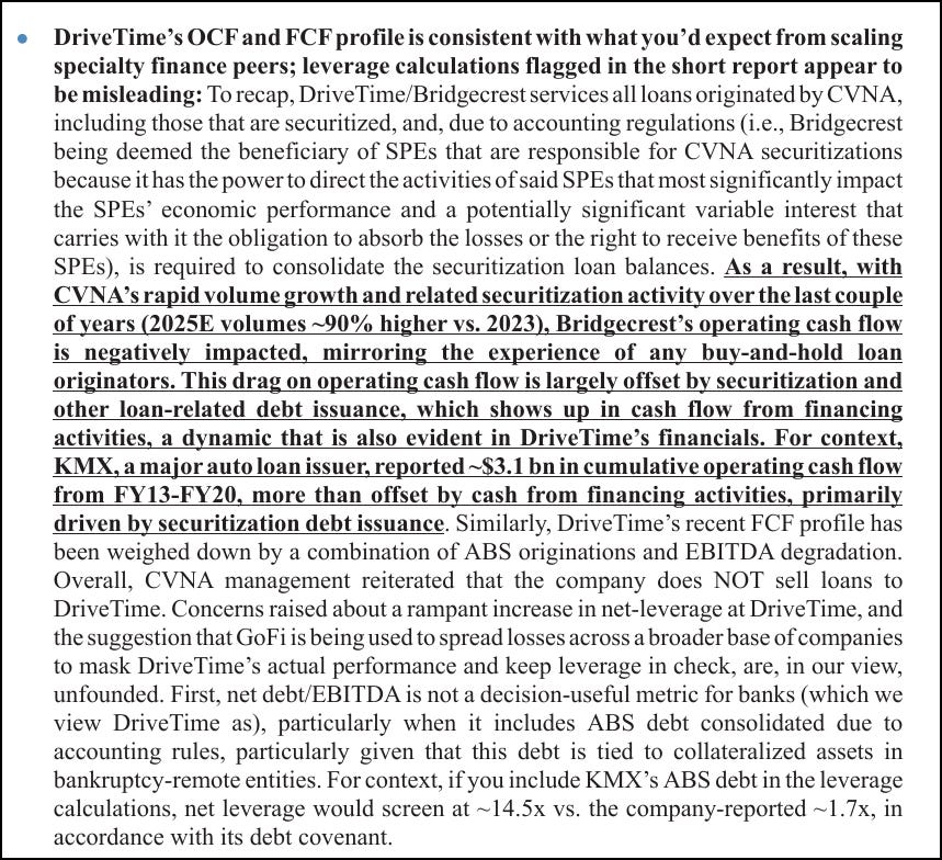 JPM highlighted CarMax (KMX), who showed similar cash flow dynamics with -$3.131B of operating cash flow from FY13-FY20 but offset it by financing activities / increasing non-recourse notes, like DT. JPM also brought up the dynamics related to Bridgecrest servicing CVNA loans and having to account for where they are the beneficiary on SPEs.