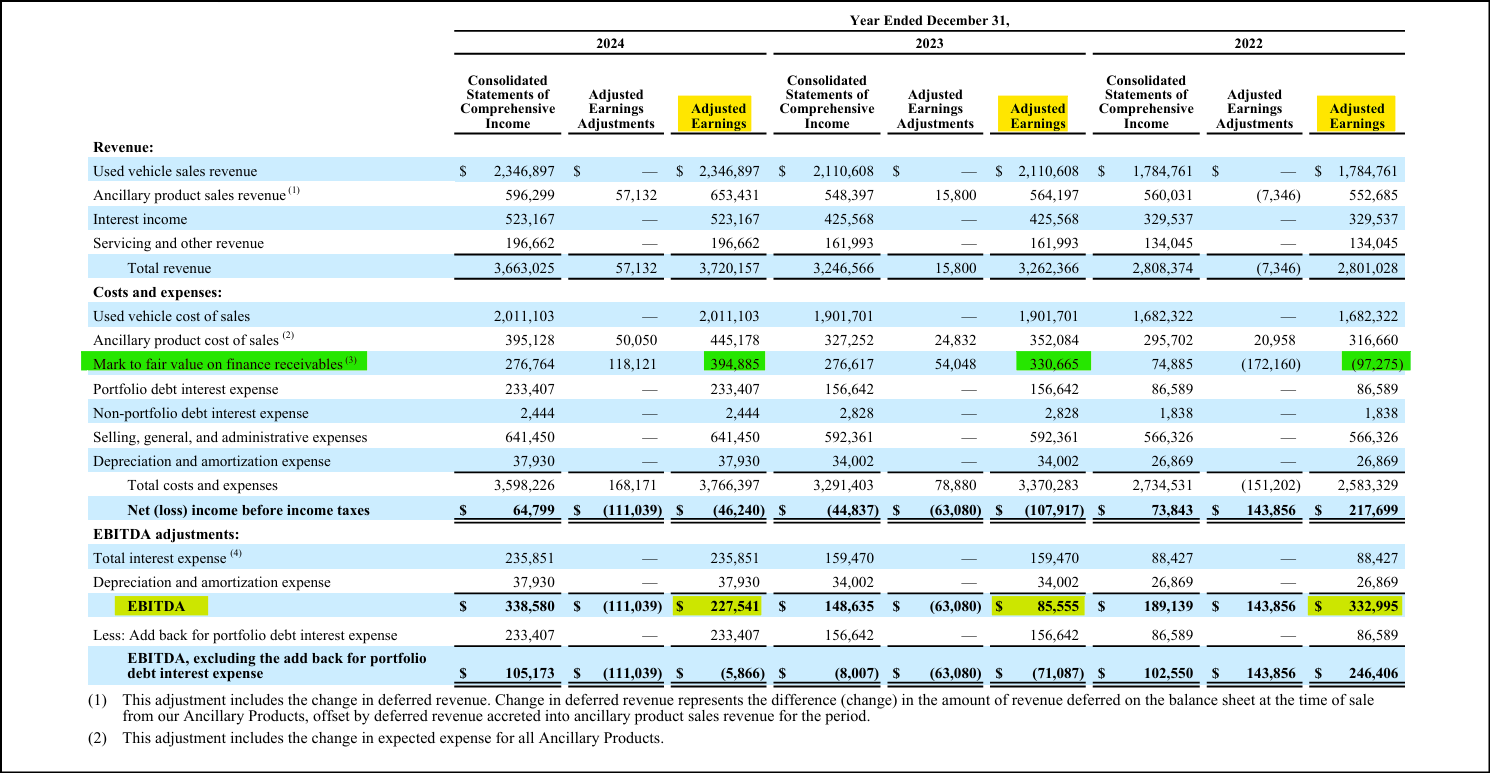You can see adj EBITDA below, on the “EBITDA” line, and under the “Adjusted Earning” columns. Above those figures within the costs / expenses, there is the “Mark to fair value on finance receivables”, where in green are the now higher negative marks for ‘23 and ‘24, and where ‘22’s mark-to-fair-value was actually a positive contributor to ‘22 adj EBITDA. Adjusting ‘23 and ‘24 for this (which is reasonable given it will normalize as the ‘22 and ‘23 vintages roll out of the portfolio), the adj EBITDA margins improve and the leverage ratios come down significantly.